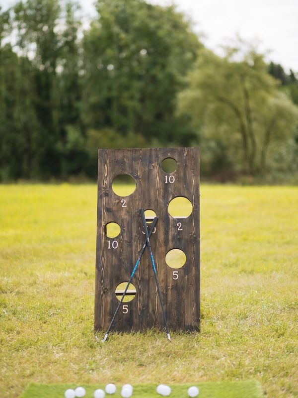 Very much a favourite! Test your golf skills with our handmade golf chipping game ! Whoever scores the highest score wins - best of five! Great way to entertain guests and add bit of light hearted competition!